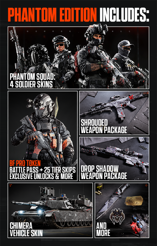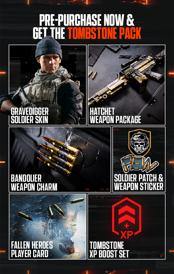 Pre-purchase the Battlefield 6: Phantom Edition and get the BF Pro Token, Phantom Squad Soldier Skins, Weapon Packages, Deluxe XP Boost, and more, in addition to the full game download of Battlefield 6. Pre-purchases of both the Phantom Edition and the Standard Edition also include the Tombstone Pack, which contains a Soldier Skin and a Tombstone XP Boost Set.